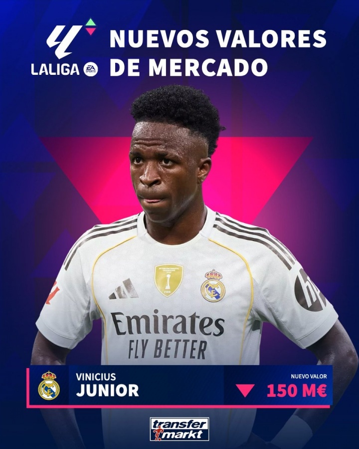 再度下降!德转当天更新西甲身价,维尼修斯下降2000万至1.5亿欧