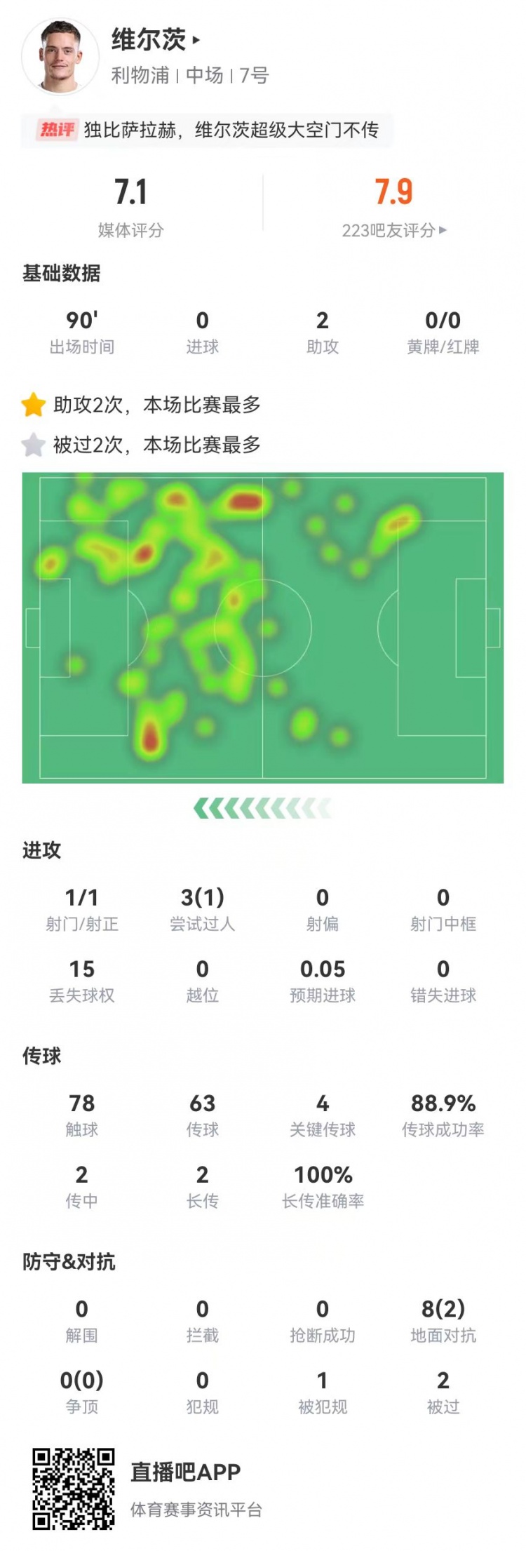维尔茨本场2助攻+4要害传球 15丢失球权 8反抗2胜利 获评7.1分