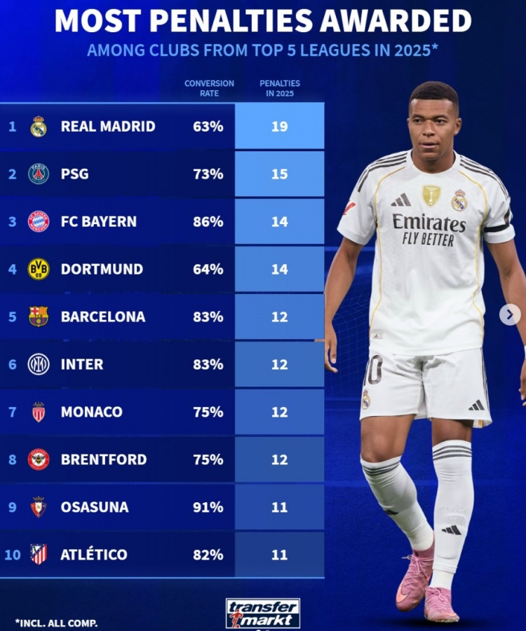 2025年五大联赛俱乐部赢得点球榜:皇马19次、巴黎15次、巴萨12次