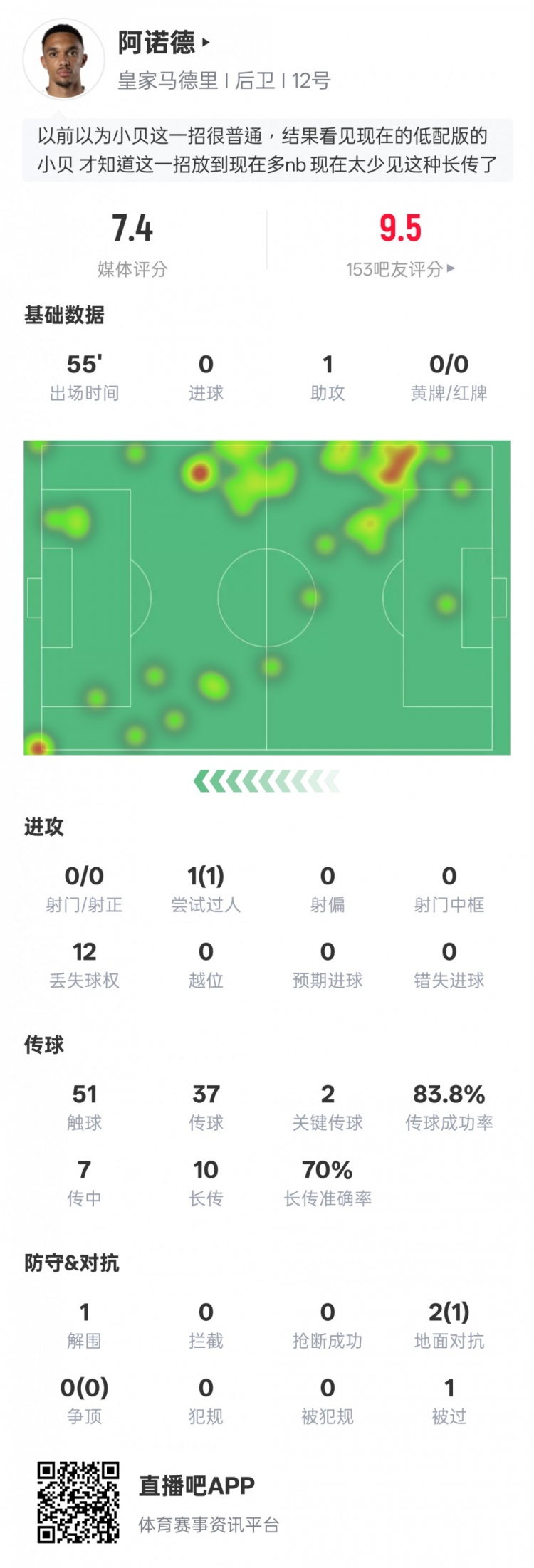 阿诺德本场比赛数据:1助攻2枢纽传球1过东谈主凯旋,评分7.4