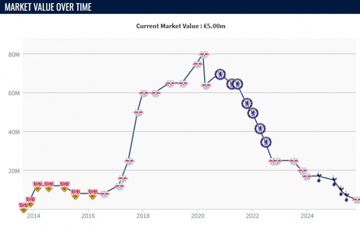 29岁的维尔纳在2020年以5300万欧元转会费加盟切尔西,亦然在2020年,球员巅峰身价一度达到8000万欧元,但如今维尔纳身价也曾跌至500万欧,他与莱比锡的公约将于明夏到期。