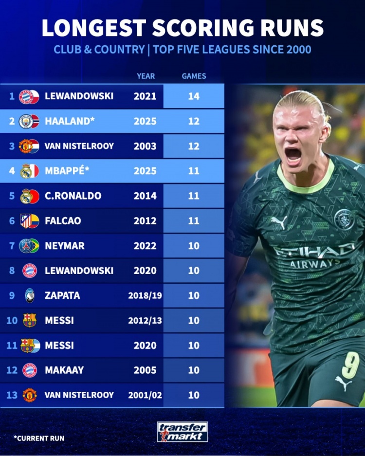 2.哈兰德,2025年,伙同12场进球(刻下记录)