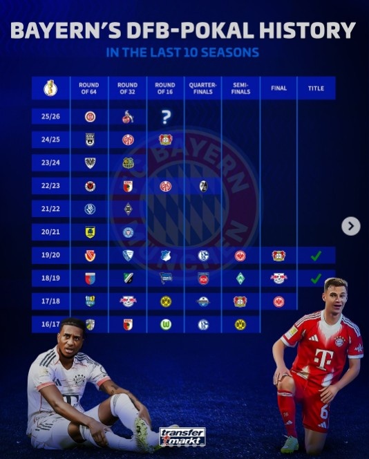 德转盘货拜仁近10个赛季德国杯战绩:3次停步32强,3次决赛两夺冠