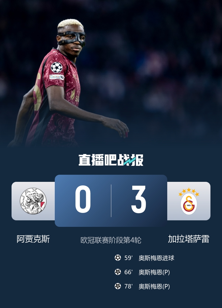 头顶脚踢!奥斯梅恩头球破门+点射双响,助加拉塔萨雷3-0阿贾克斯