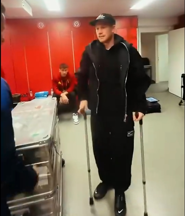 心系球队!比利时取胜即出线,34岁德布劳内拄双拐现身球队更衣室
