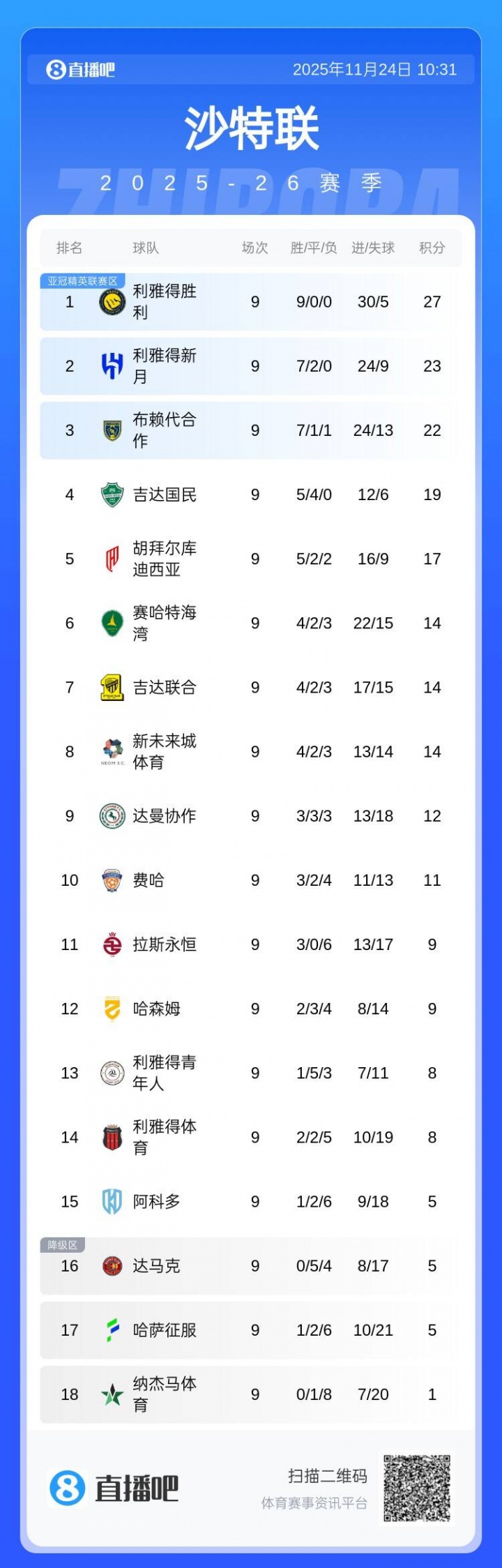 积分榜上,获胜当今全胜的同期4分领跑,利雅得月牙不败排在第2,卫冕冠军吉达蚁集仅排行第7。
