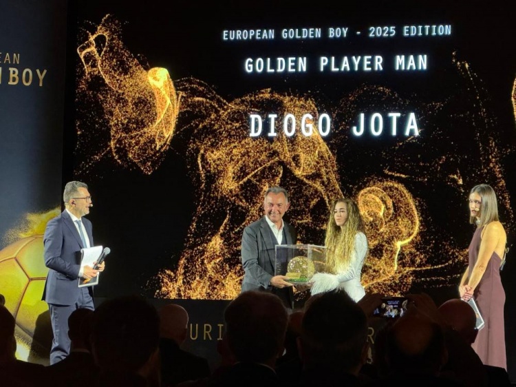 12月2日讯 在《皆灵体育报》金童奖受奖仪式上,在本年夏天车祸去世的若塔被象征性地授予了“年度金球员”荣誉,他的遗孀鲁特·卡尔多索上台领取了这份奖项。
