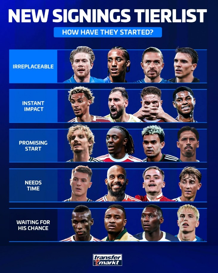 10月1日讯 德转为本赛季新援进展作念出评级,其中德布劳内、若昂-佩德罗等最为出色,具体如下: