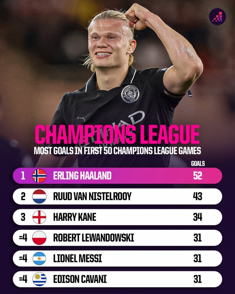 10月2日讯 Squawka统计了球员在前50场欧冠比赛中的进球数目,并排出榜单,哈兰德52球断层居首。