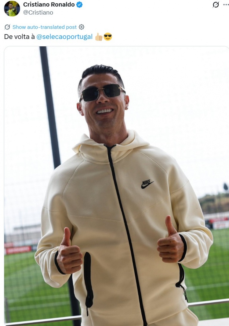 C罗社媒晒回到葡萄牙国度队报说念像片,戴墨镜出镜帅气完竣