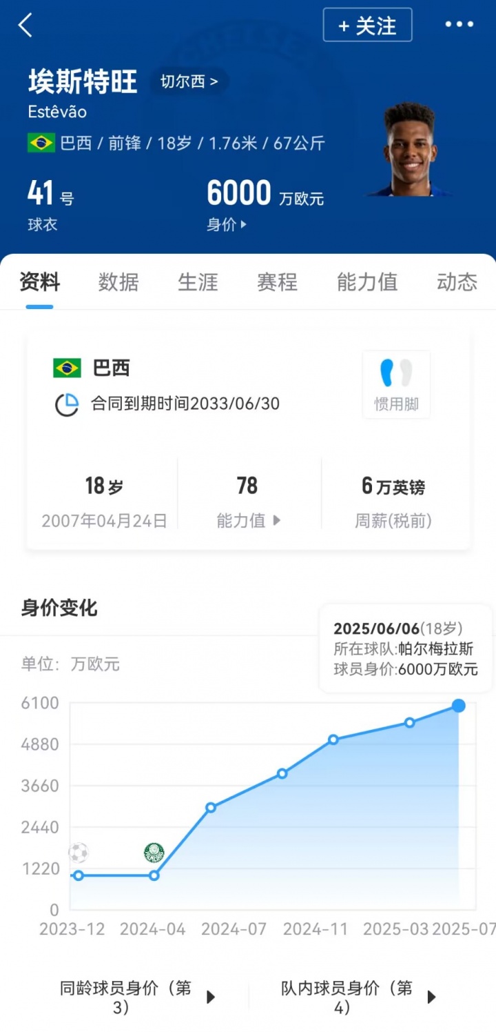 在埃斯特旺16岁时,德转为其设定的起步身价就达到了1000万欧;2年间他的身价依然一起高潮来到了6000万欧,在2007年建立的同龄东说念主中仅次于亚马尔和库巴西。