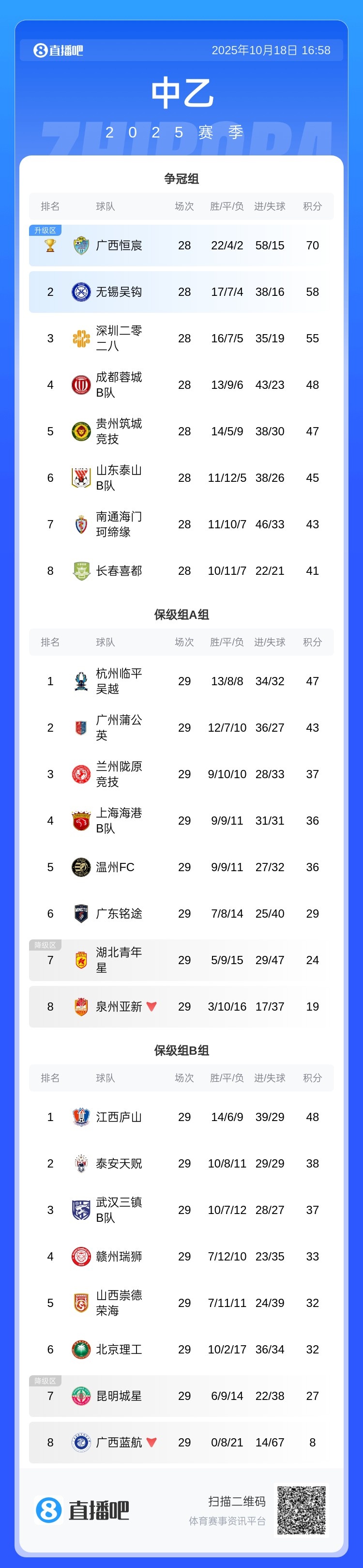 中乙保级组第29轮综述:湖北后生星、昆明城星输球左迁