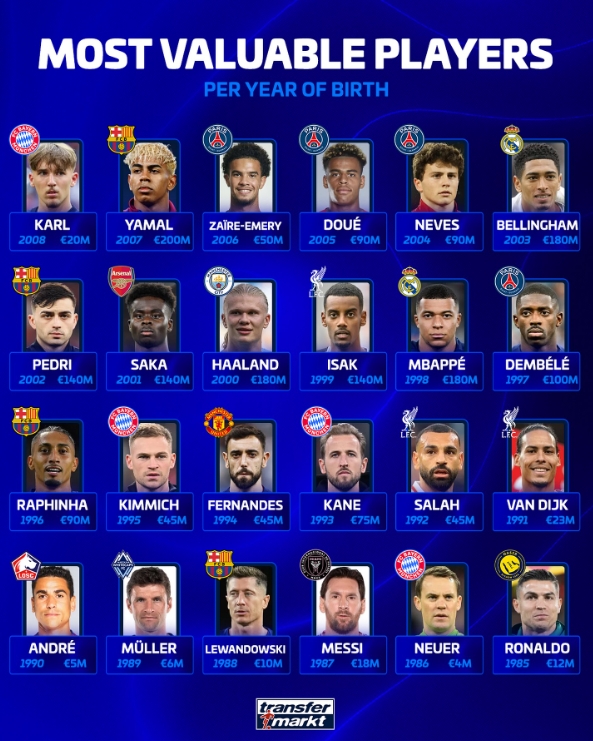 德转列各年岁段身价最高球员:梅罗上榜,哈兰德、姆巴佩在列