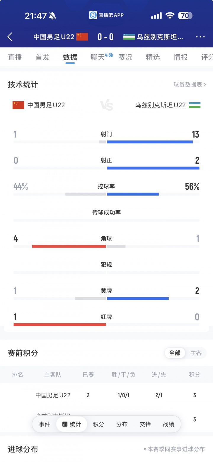全场仅1脚射门!全场数据:U22国足射门1-13逾期乌兹别克斯坦