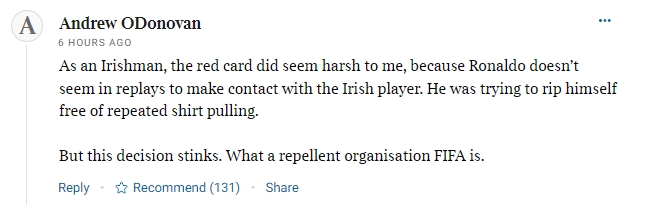 球迷1:行动爱尔兰东谈主,我个东谈主认为那张红牌给得太重了,因为从慢镜头回放来看,C罗似乎根柢莫得际遇爱尔兰后卫,他仅仅一直在试图挣脱对方反复拉扯他球衣的动作。但(国际足联)的决定烂透了。他们真的个令东谈主厌恶的组织。