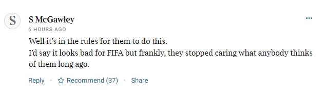 球迷5:好吧,确乎法例允许他们这样办。我会说这样让FIFA看起来很糟,但说白了他们从很久之前运转,就不在乎别东谈主何如看待他们了。