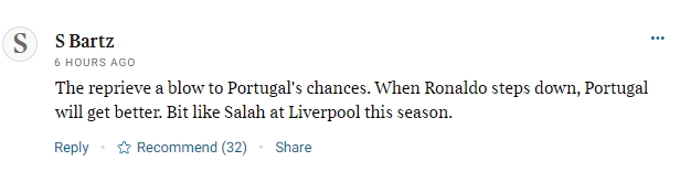 球迷4:这种宽待对葡萄牙的胜算来说是一记重击。当C罗退下来之后,葡萄牙才会变得更好。有点像本赛季利物浦的萨拉赫。