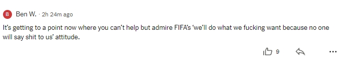球迷8:当今照旧到了让东谈主不得不佩服FIFA那种:“咱们思干嘛就干嘛,因为没东谈主会说一句滥调”的经过。
