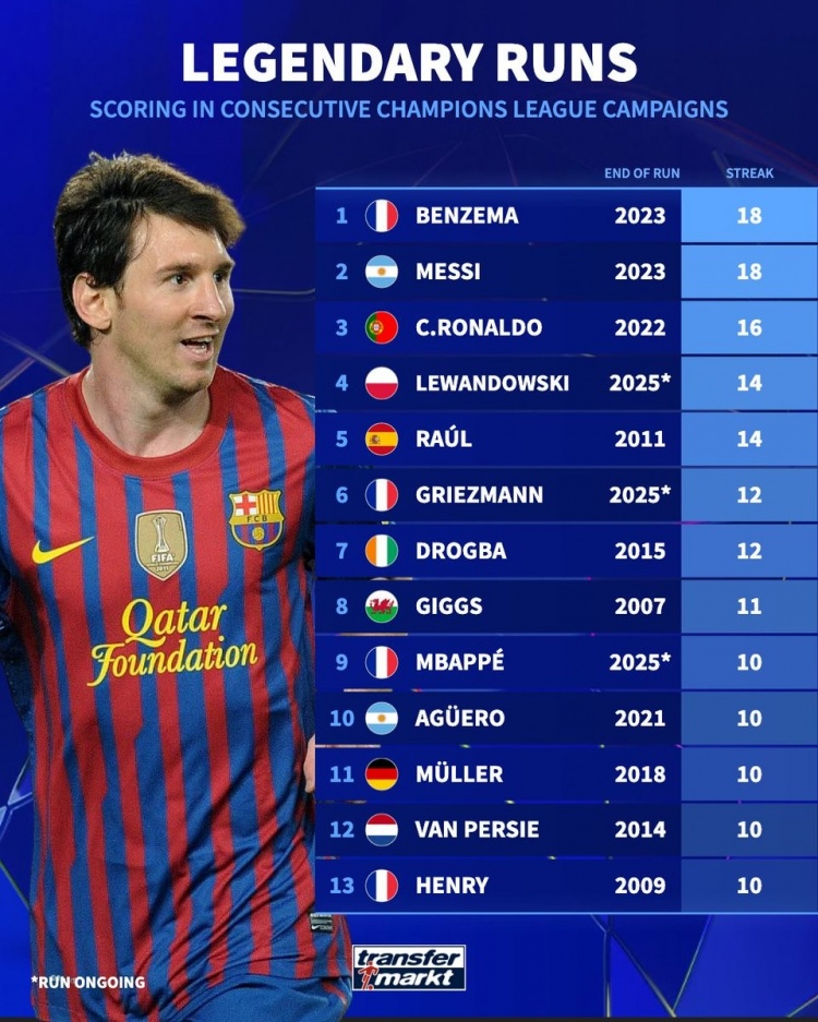 11月27日讯 《转会市集》统计了欧冠历史赛季连结进球情况,梅西和本泽马比肩居首。