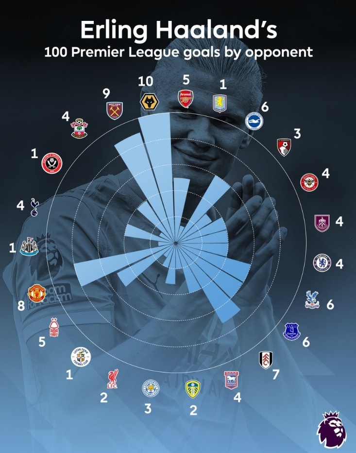 英超官方晒哈兰德百球区分:对狼队10球最多,曼联8球、枪手5球
