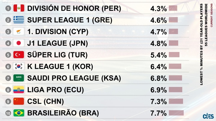 10月18日讯 近日,足球巨擘统计机构CIES发布最新统计,公共55个联赛中U21球员出场时间占比最少的联赛,秘鲁联赛4.3%居首,J联赛4.8%第4,K联赛6.4%第6,中超7.3%第9。