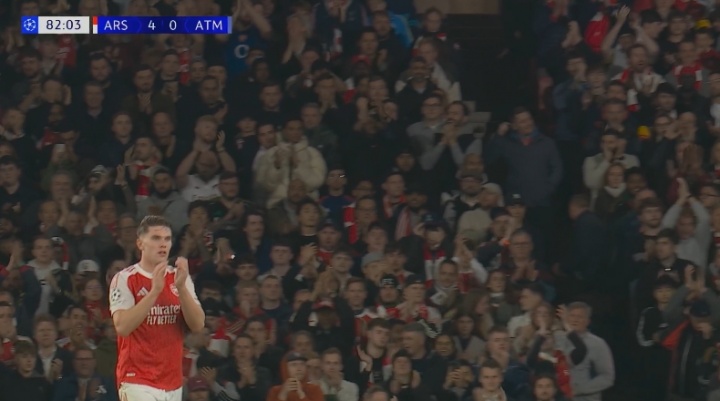 10月22日讯 阿森纳vs马竞第83分钟,约克雷斯下场,接收全场掌声!