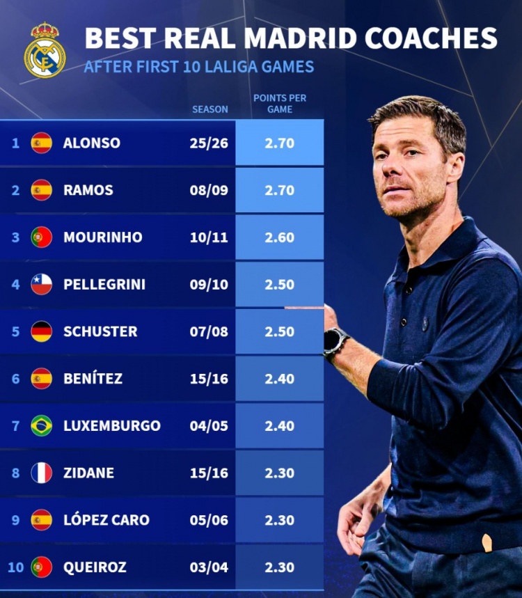 皇马主帅前10场西甲场均拿分榜:阿隆索2.7分比肩居首,穆帅第3