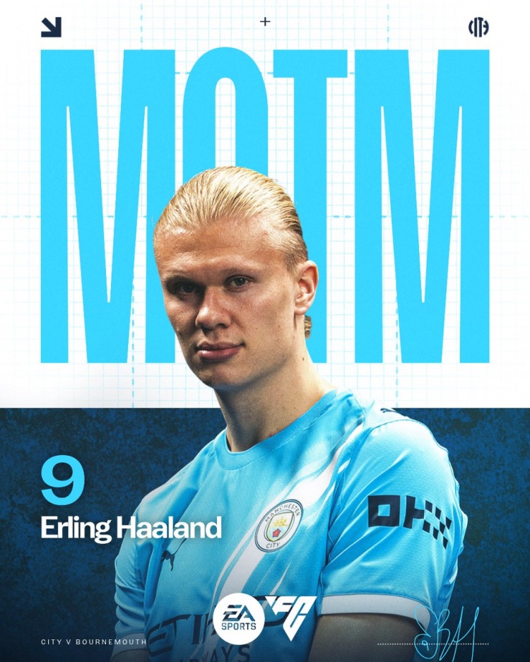 2进球+2过东说念观念效,哈兰德当选曼城3-1伯恩茅斯一役队内最好
