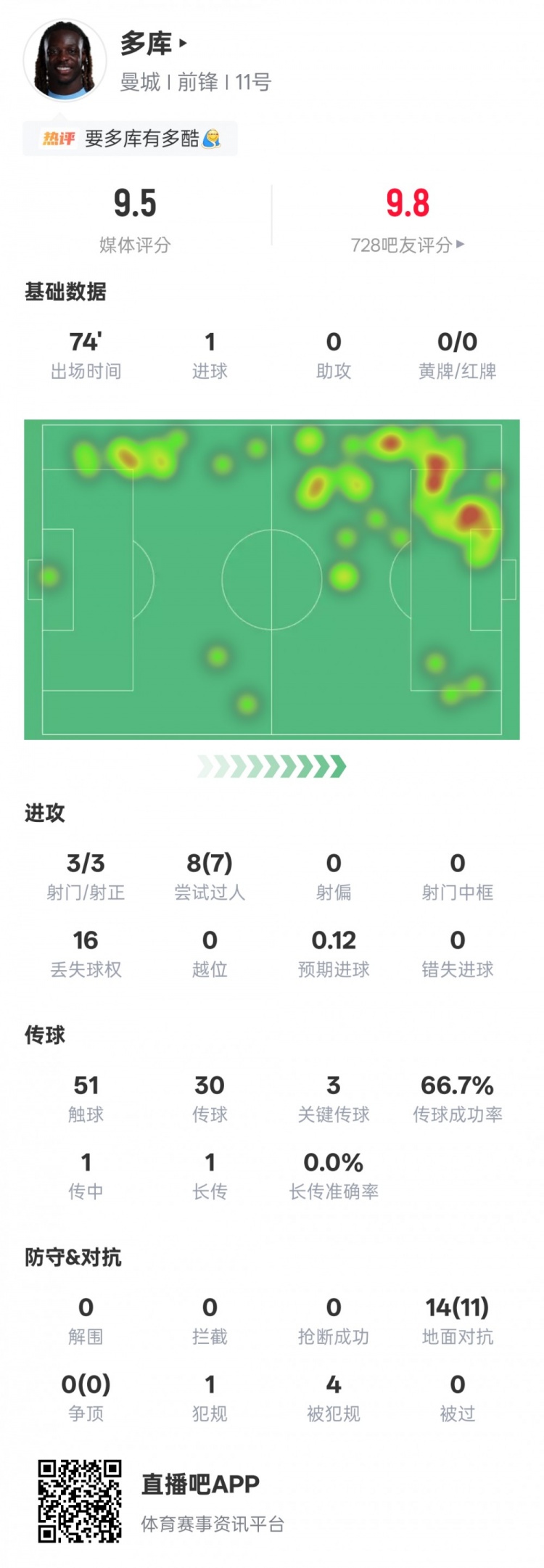 11月10日讯 英超第11轮焦点战,曼城主场迎战利物浦。多库首发登场,孝顺1粒进球,8次过东说念主7次得胜,送出3次环节传球,评分9.5。