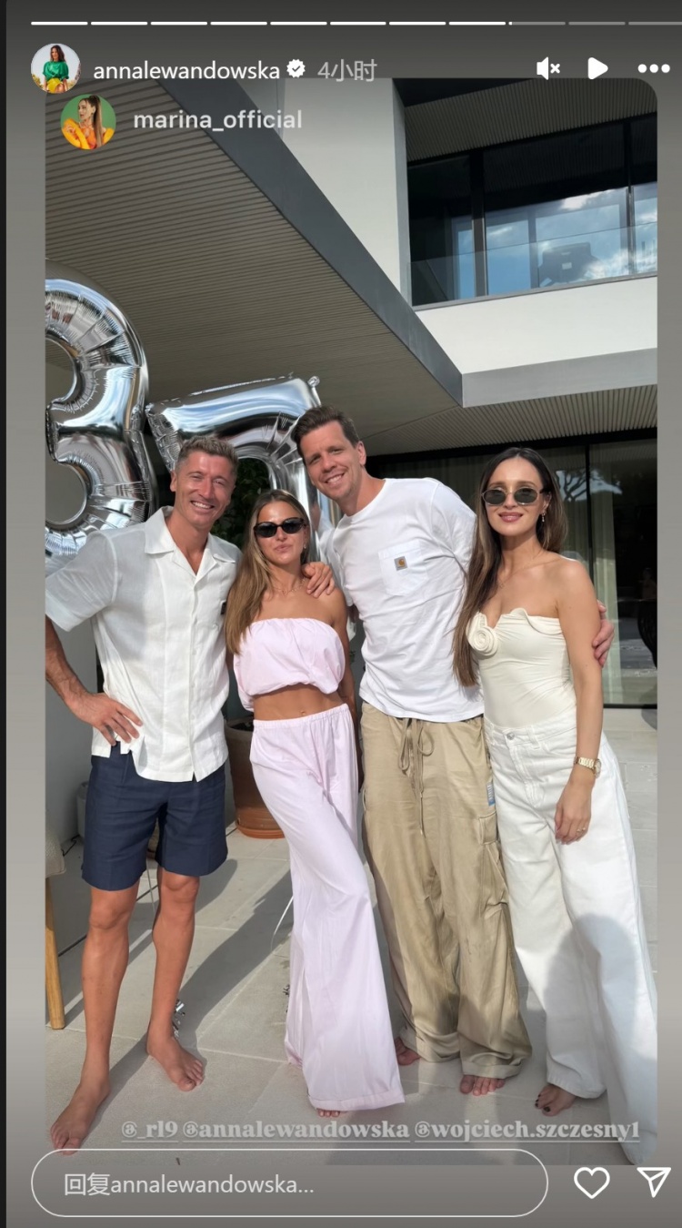 巴萨时尚莱万迎来了37岁生辰,妻子安娜在外交媒体上晒出身日约聚相片和视频,祝莱万生辰旺盛,什琴斯尼也插足了约聚。