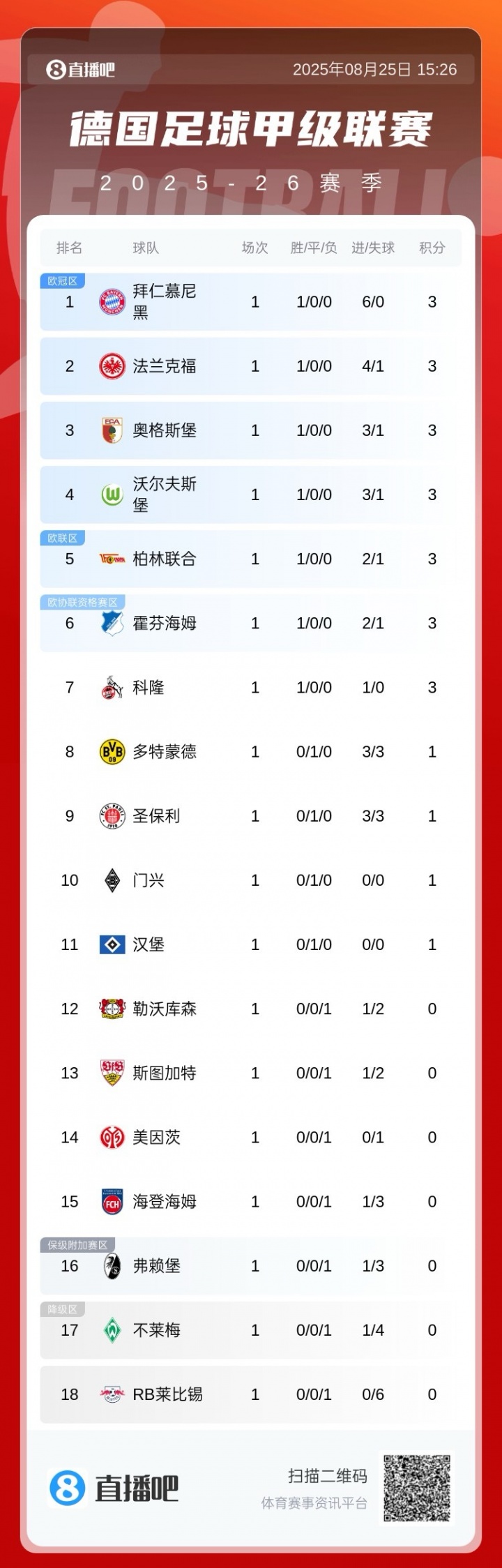 德甲升班马(2队1轮共4分)
