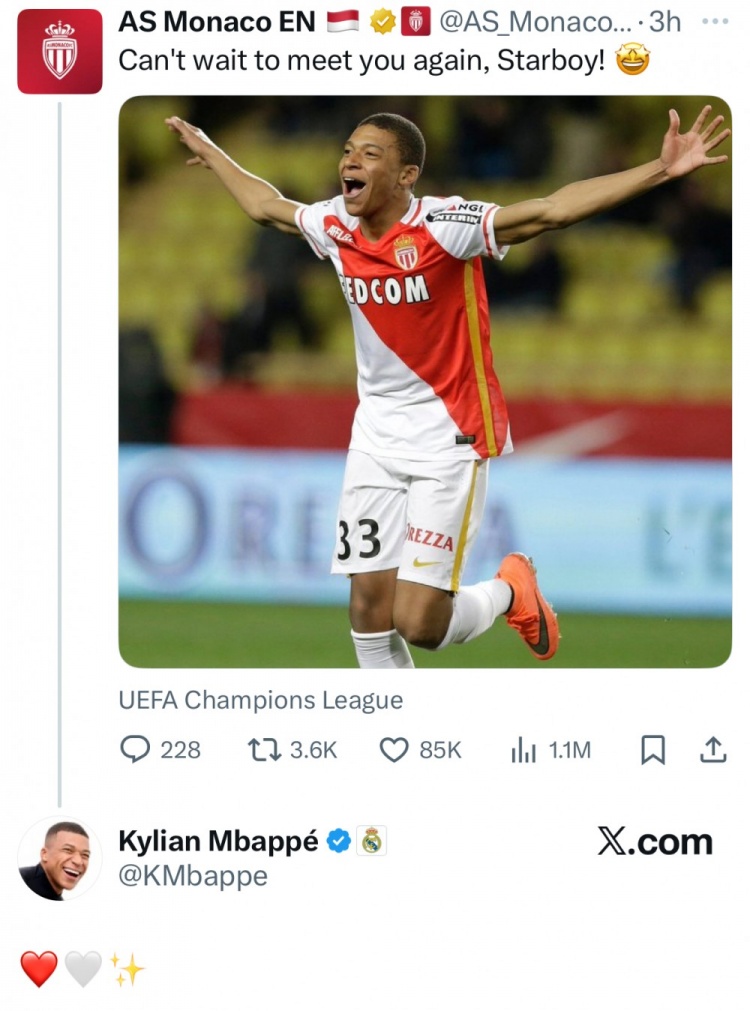 摩纳哥社媒晒姆巴佩青涩照:迫不足待念念见你,后者回话:❤️🤍