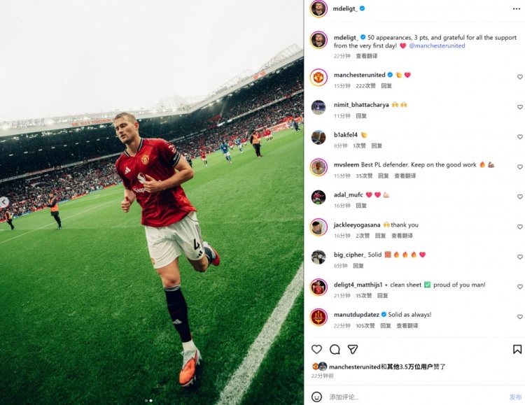 本场比赛德里赫特首发出场迎来曼联糊口50场里程碑,赛后他也在社媒晒照写谈:“50次出场,拿下三分,感谢从始至终齐支持咱们的球迷们!”