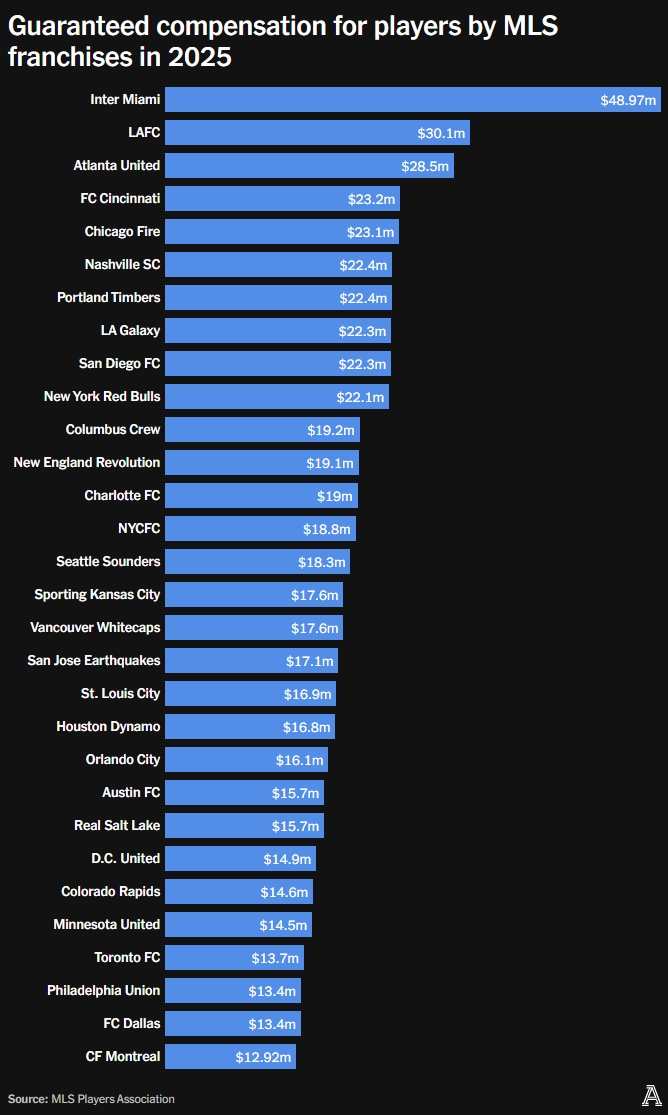 10月30日讯 好意思国做事足球大定约球员协会发布了年度球员薪资数据,球队薪资中迈阿密总薪资4897万好意思元名次序一,球员中梅西2045万好意思元居首。