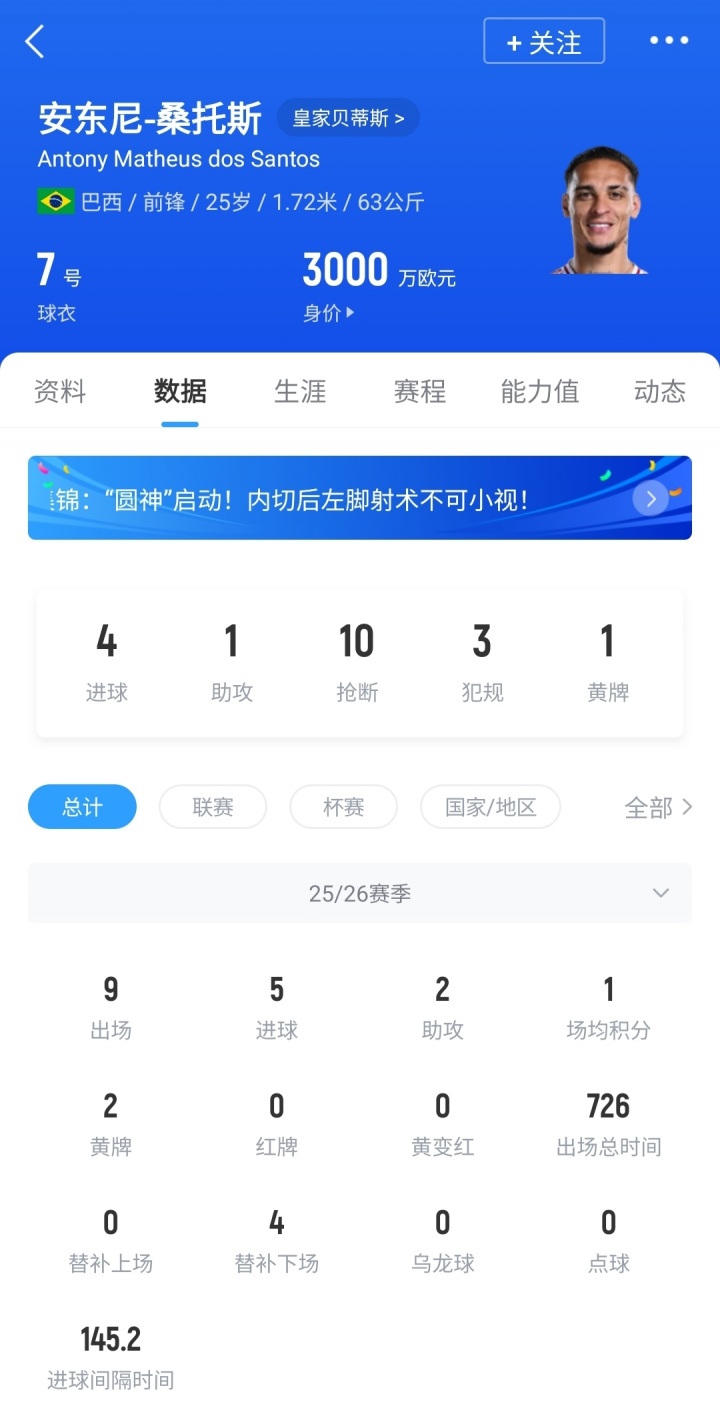 今夏以2200万欧恒久转会贝蒂斯后,安东尼景象出色,各项赛事出战9场比赛,孝敬5球2助,上一轮西甲安东尼2度轰出全国波,并有1次助攻,包办3球匡助球队3-0打败马洛卡。