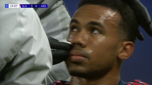 11月05日讯 欧冠阿森纳vs布拉格斯拉维亚第18分钟,加布里埃尔被击中面部,队医处置后连续比赛。