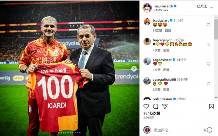 伊卡尔迪获赠加拉塔萨雷百场挂牵球衣,加盟以来68球22助