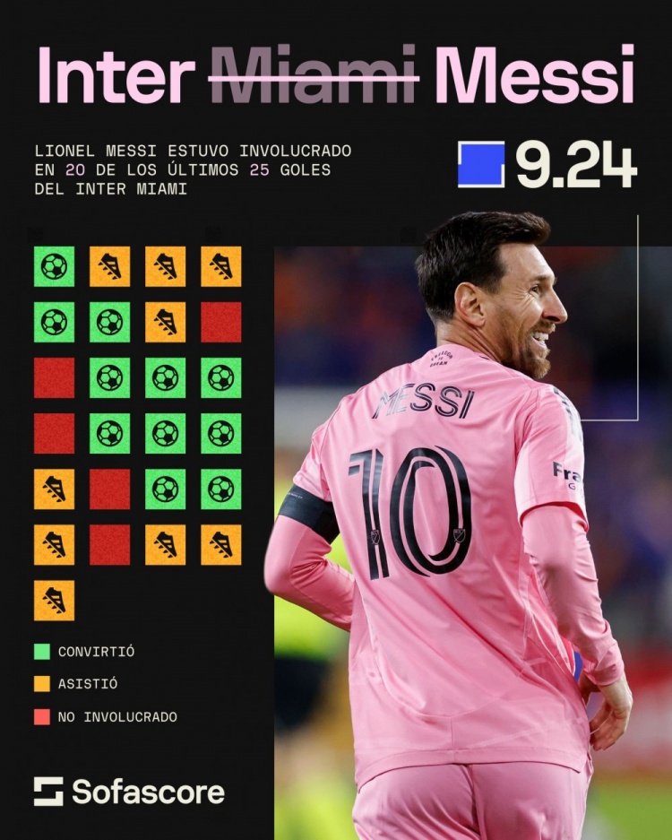 据Sofascore统计,迈阿密海外近7场比赛打进25球,梅西打进11球,助攻9次,参与20球,占比全队进球的80%,场均获评9.24分。