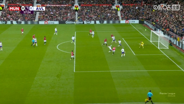 03月15日讯 英超第30轮,曼联vs维拉。赛事第38分钟,曼联获得第一节间歇时间以来的最佳机会!B费挑传达洛特,后者把球打高了。